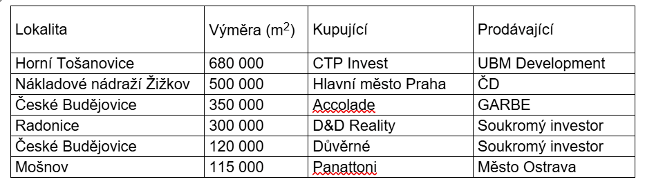 Výběr významných pozemkových transakcí realizovaných v r. 2023-2025
